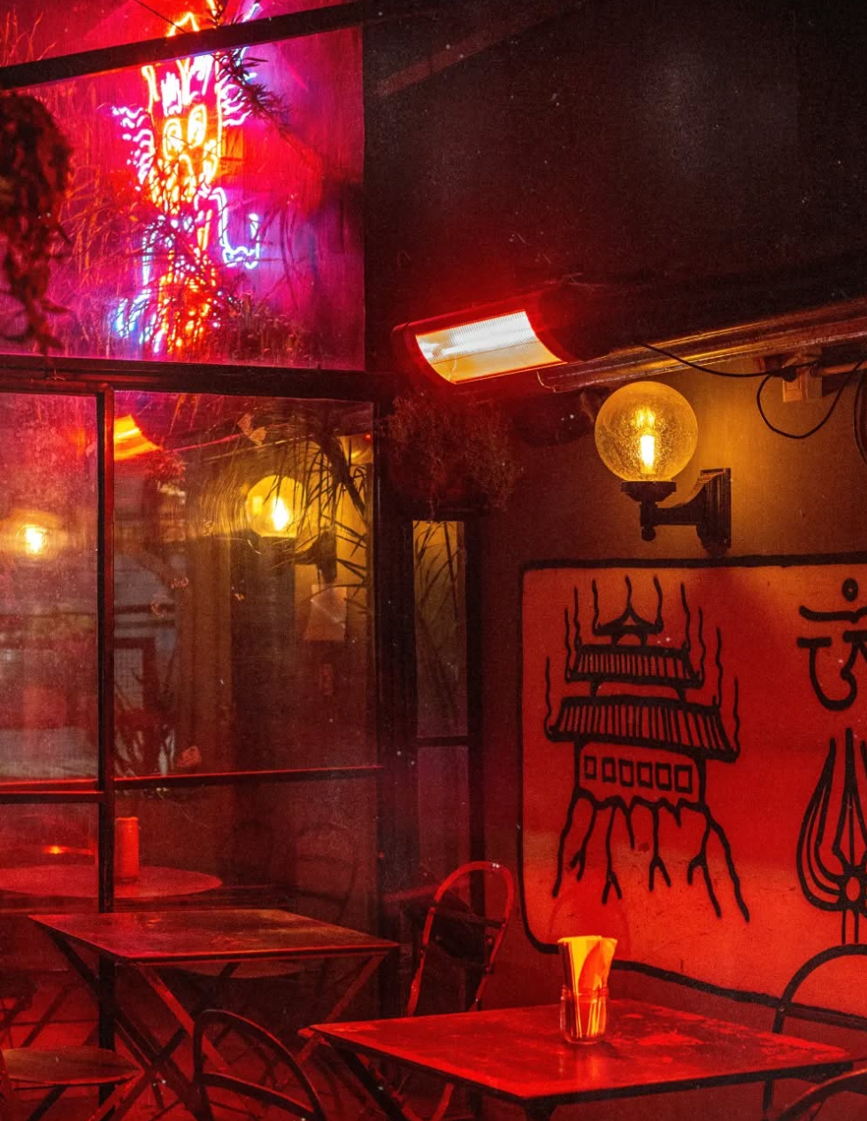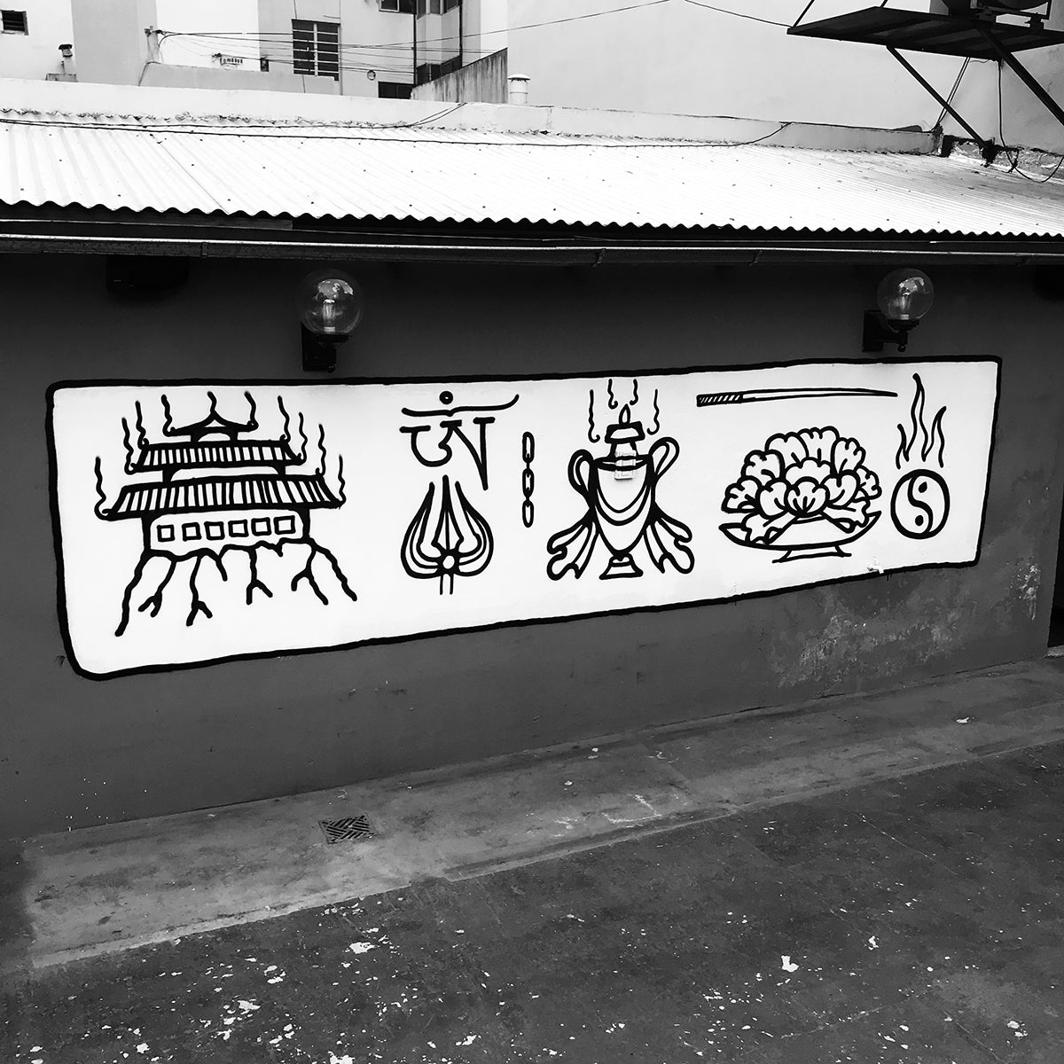 El nombre surge de la traducción de Bután: Druk Yul, “la tierra del dragón del trueno”. Bajo esa idea, el mural reúne símbolos de espiritualidad y transformación: un templo, un OM, un tridente de Shiva, un jarrón, un loto y un yin yang.