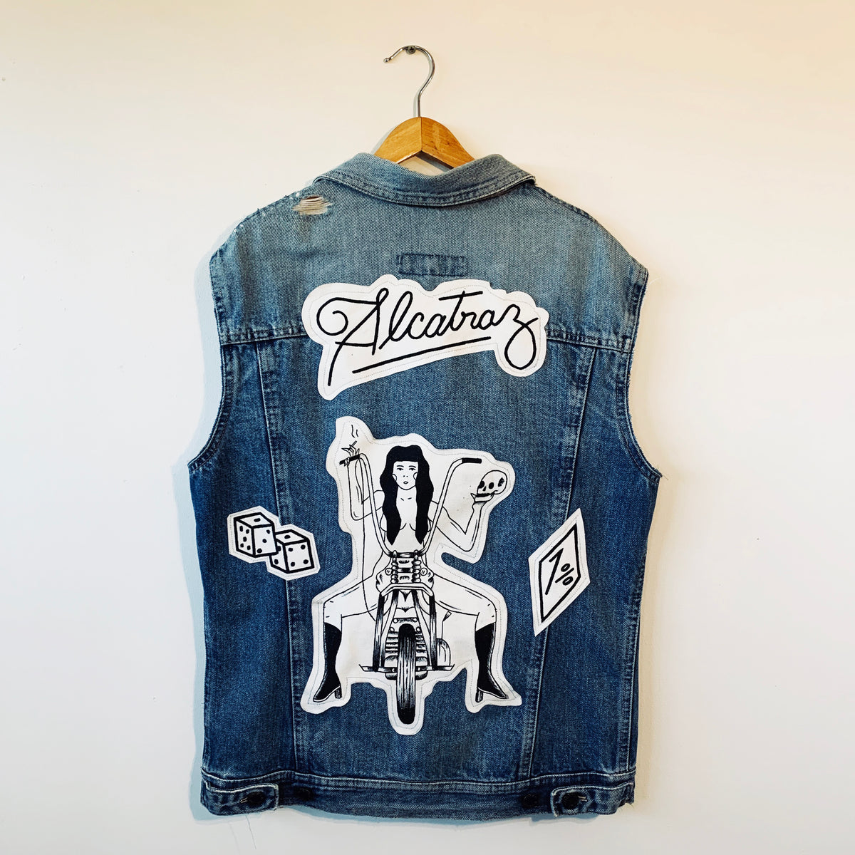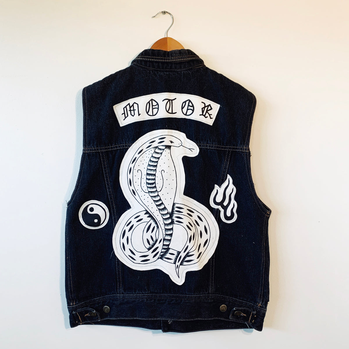 Tres chalecos de jean intervenidos con parches pintados a mano y bordados, inspirados en la estética de los clubes de motos.